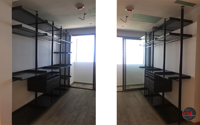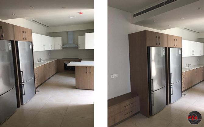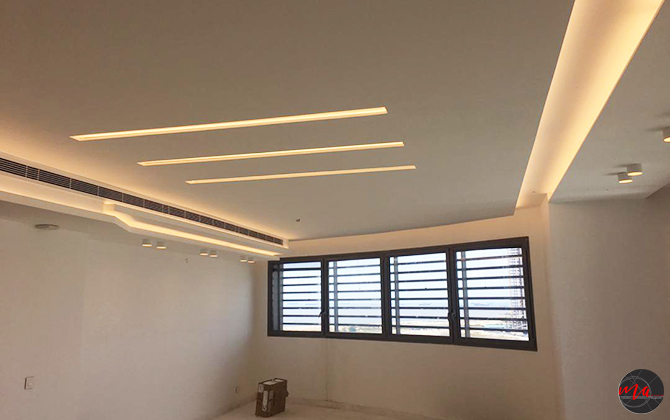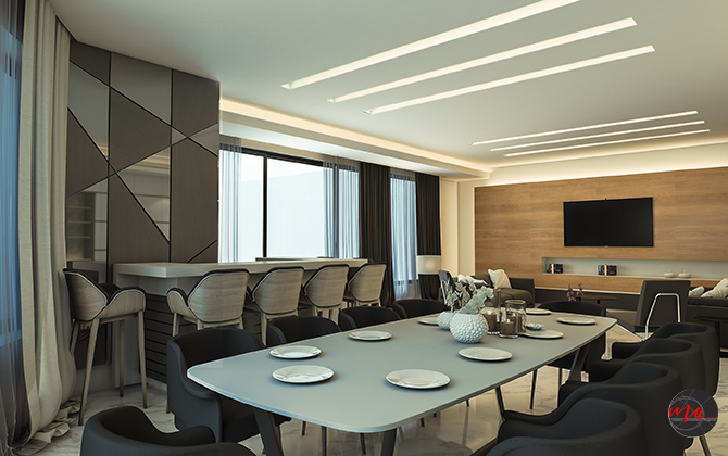 Natural wood integrated with modern open space design, simplified geometry, detailed clean-cut lines, wood engraves and niches, with simple furniture choice.