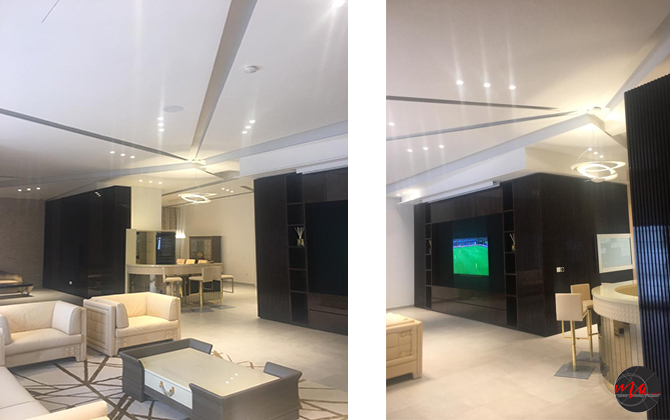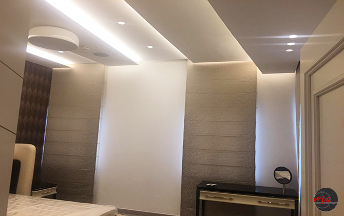 contemporary designed apartment, embraced with art deco furniture, modernist textiles and wood finishes, use of natural materials paired with industrial-inspired elements (steel and glass), constructive ceiling design with sharp clear light forms, varsity in use of light provide space with form and aesthetic charm