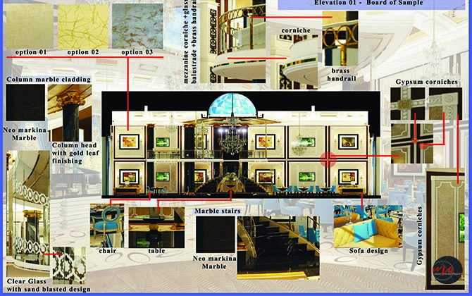 A Restaurant with Luxury Neoclassism interior touch that drew inspiration from the art and culture of classical antiquity. the double-height and welcoming stairs to the hotel side created the luxury look