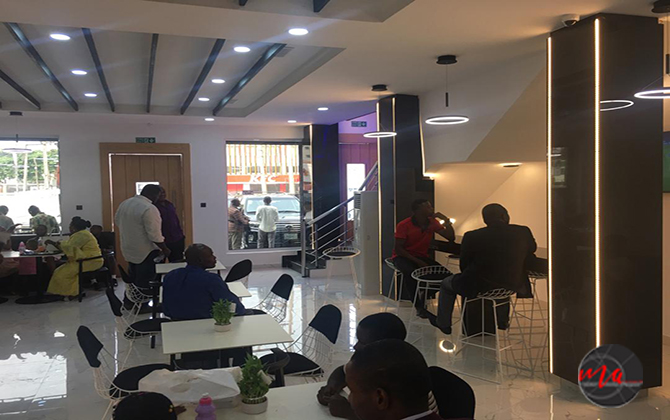 Unconventional designed Food space with natural interfusion, detail-oriented, a universal experience for its Nigerian and international customers, Blackbell emphasizes the simple modern styled space with sophisticated interior lines, black and white color palette emphasizing the taste and aroma of the space with a cozy light display creating a unique interactive visual experience for every customer every time.